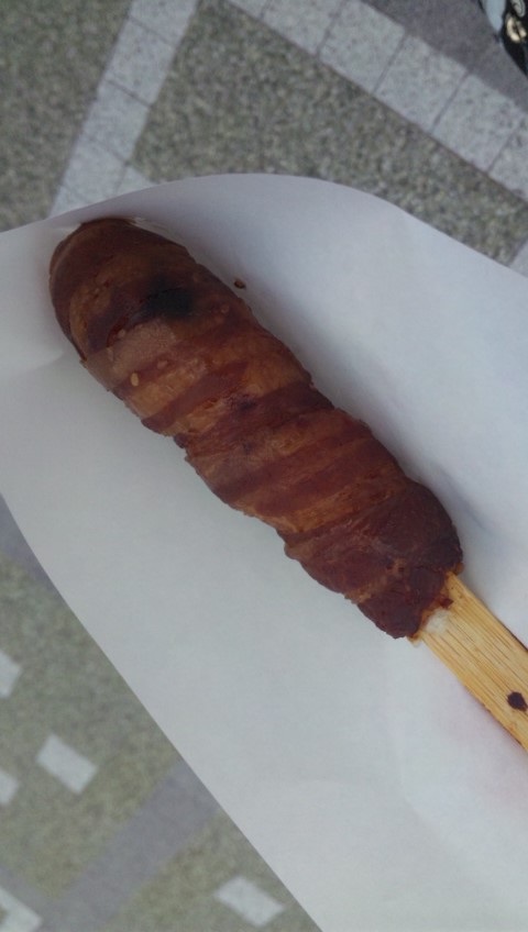 肉巻き!350円味普通甘め〜生肉を米に巻いてから焼いてるので肉に隣接してる米はパリパリ〜。面白い食べ物だね〜